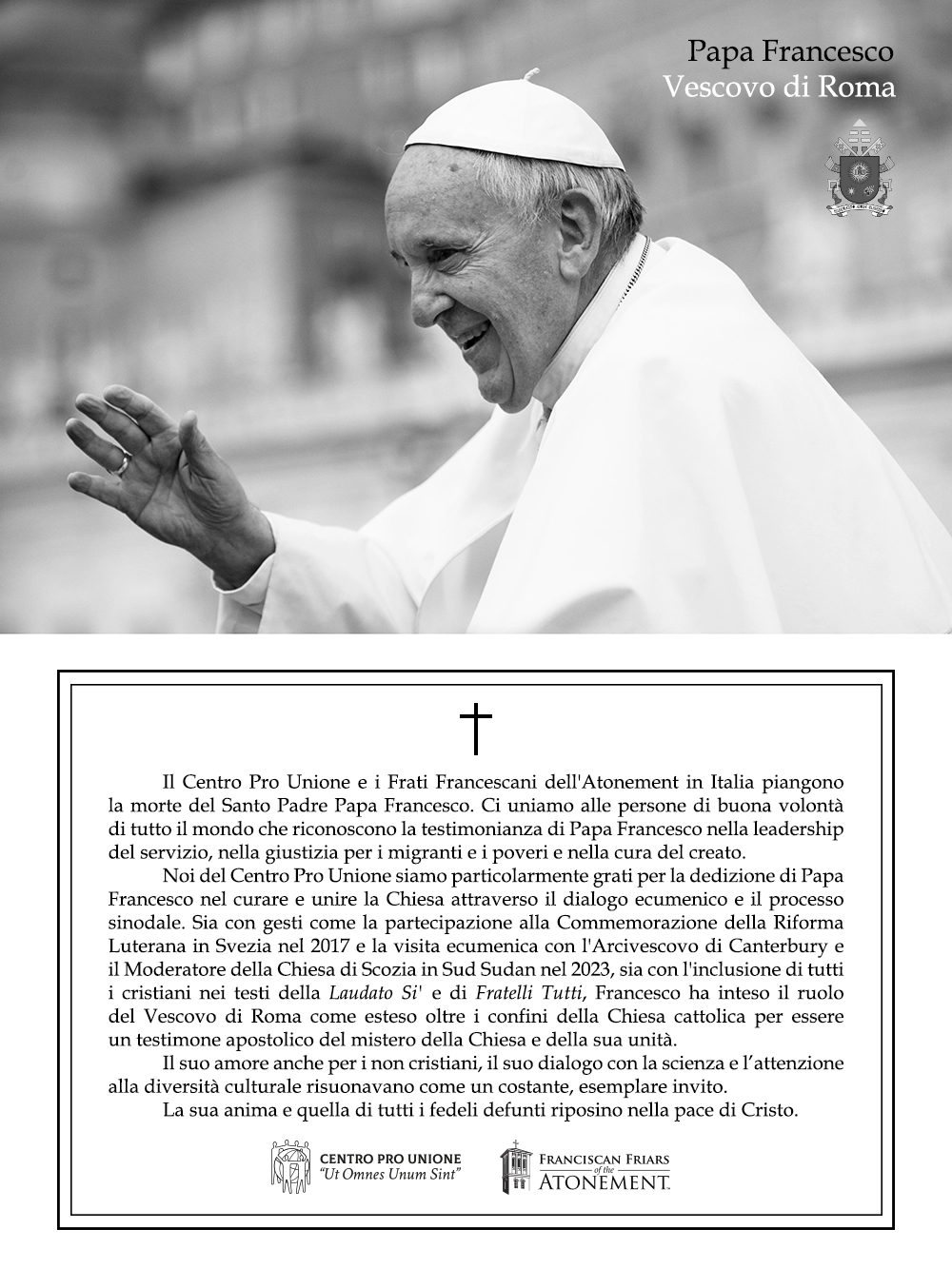 The Franciscan Friars of the Atonement and the Staff of the Centro Pro Unione join the Family of Paul Crow and the Disciples of Christ in rejoicing for having known and worked with Paul on many occasions. We join in the sadness at the loss of a dedicated ecumenist. We share the announcement of his passing to all of our friends: